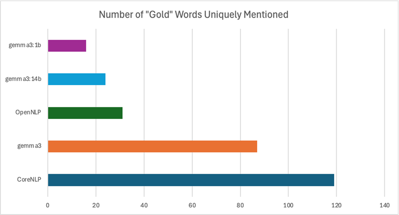 As expected, CoreNLP and gemma3 pick up on the most unique gold words. Interestingly, the small and large gemma variants had the fewest unique gold words – even less than OpenNLP.