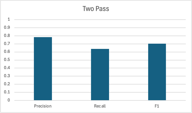 Unfortunately, this approach was actually less performant, with an F1 score lower than CoreNLP or gemma3 operating individually. Instead of finding a way to include those “unique” gold words, it looks like the LLM had an inclination to delete the names output by CoreNLP. (In a later chart, you’ll see the total number of words output in this “two pass” pipeline is very similar to the number output by gemma3 alone.) While there are certainly a variety of ways to tweak the pipeline, it seemed we weren’t going to obtain the results we were looking for with this approach.
