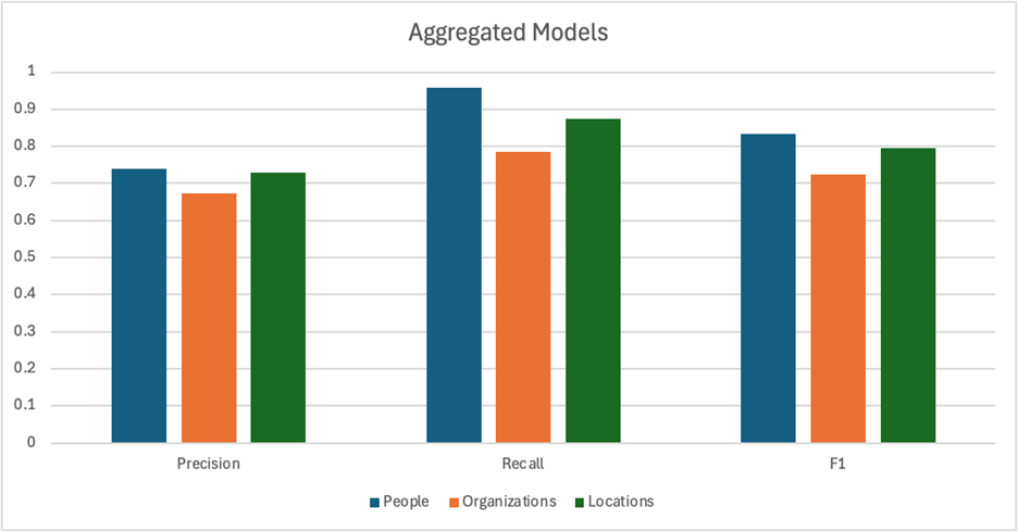 For the purposes of evaluation, we did not index the documents into a search engine. Instead, they were indexed into a CSV, which stored the original text, annotated entities, and output from each model. We then ran a custom script to analyze the models’ performance. Using the annotated people, organizations, and locations from the wikigold dataset, we were able to compute some key metrics for each model: