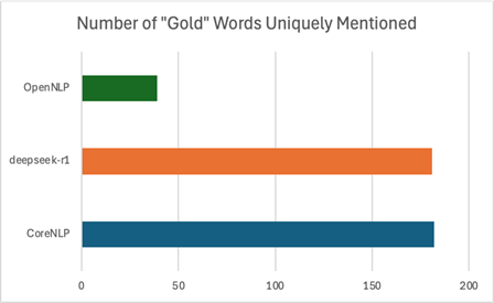 - Alternate Model: We evaluated another popular model, deepseek-r1, against OpenNLP and CoreNLP, to see if there were any notable differences.