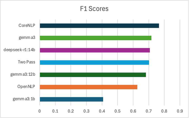 - Baseline: We started by evaluating the performance of OpenNLP, CoreNLP, and Google’s gemma3, a popular and capable open-source LLM. The default version of the model is about 3 GB in size and has roughly 4 billion parameters, making it suitable for use on modern hardware. For each model, we evaluated its precision, recall, and F1 score.