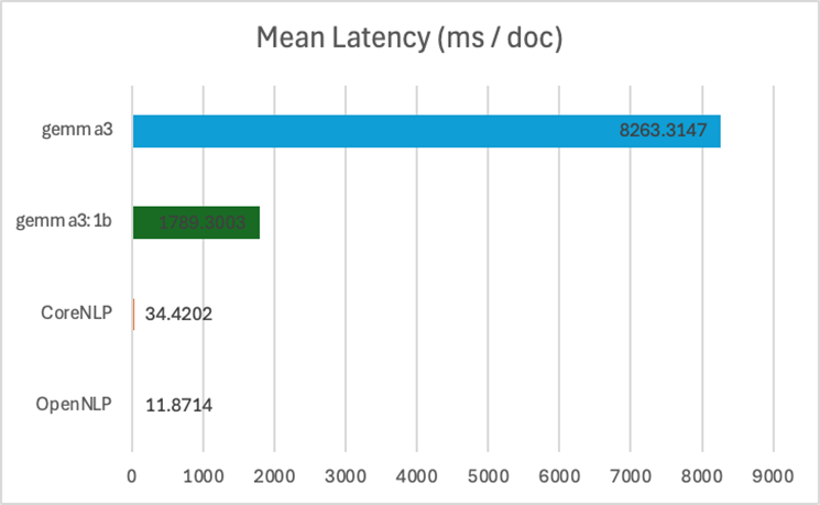 Clearly, CoreNLP is the strongest contender here, with gemma3 in a close second. Both had similar F1 scores of about ~0.75. OpenNLP wasn’t the strongest contender with a lower F1 score. We should also consider the latency associated with running the LLM.